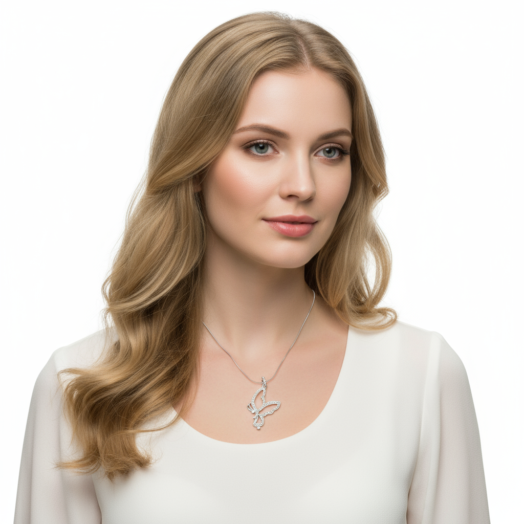 Collana con ciondolo a forma di grande farfalla tempestata di luminosi strass bianchi