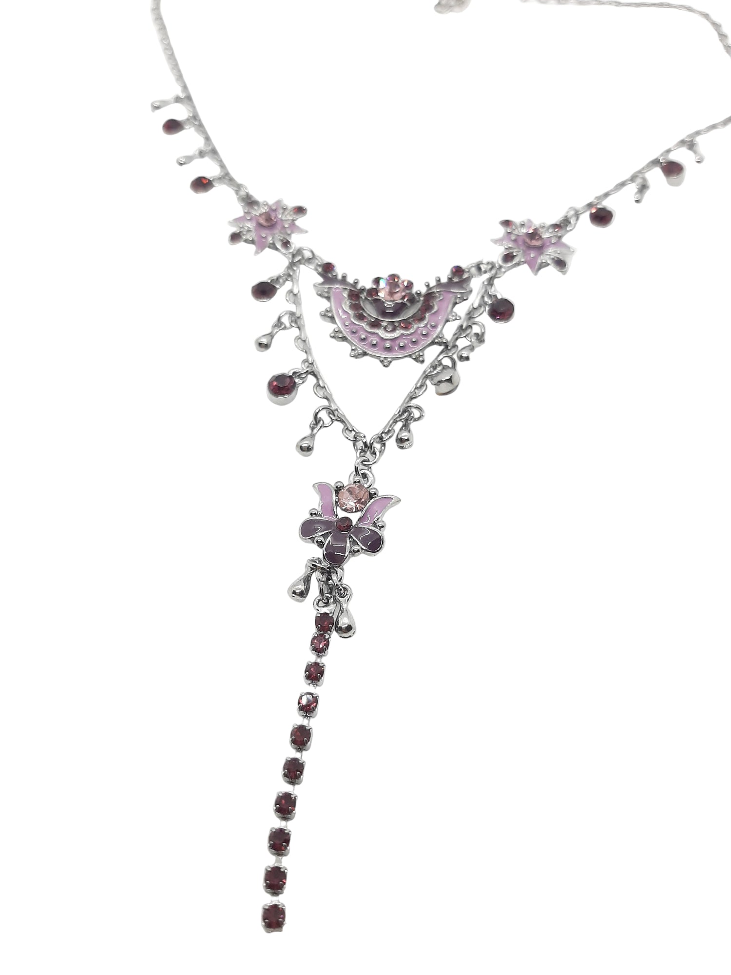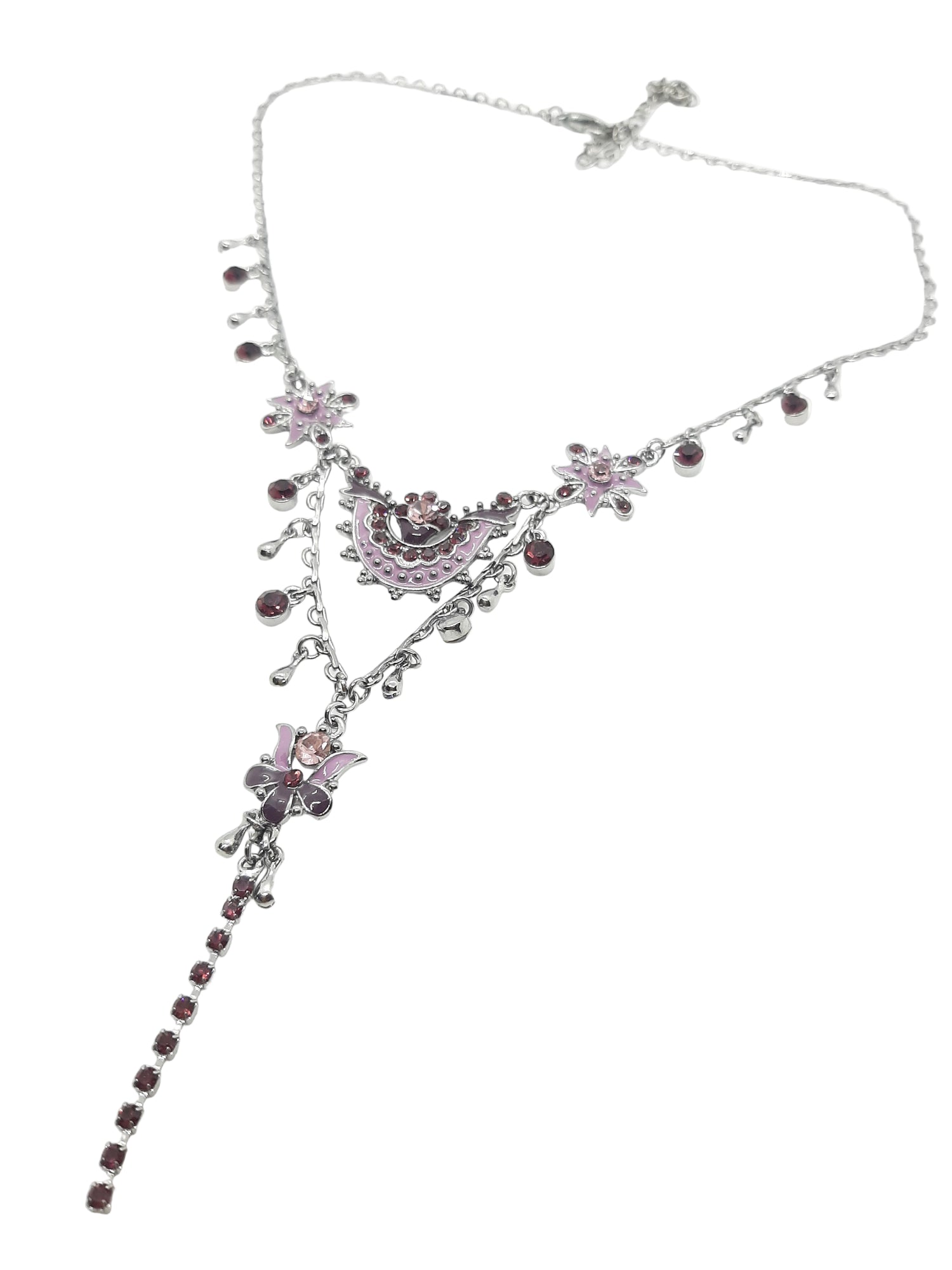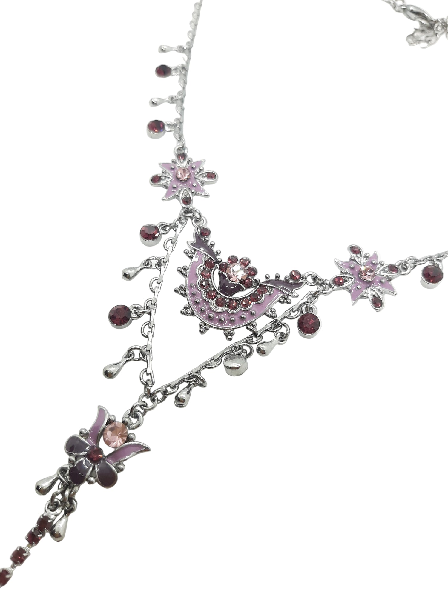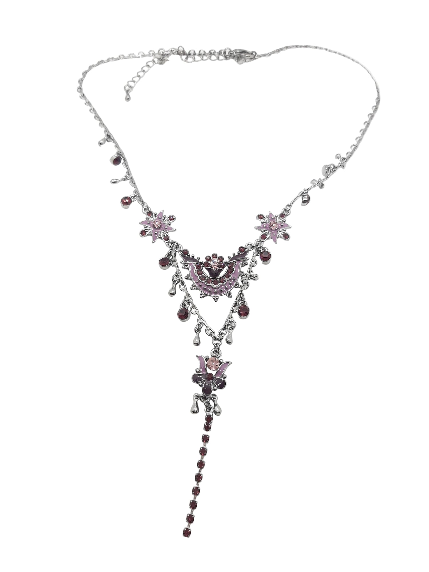 Collana in metallo anallergico e smalti sui toni del viola. Motivo floreale con prendete in strass viola.