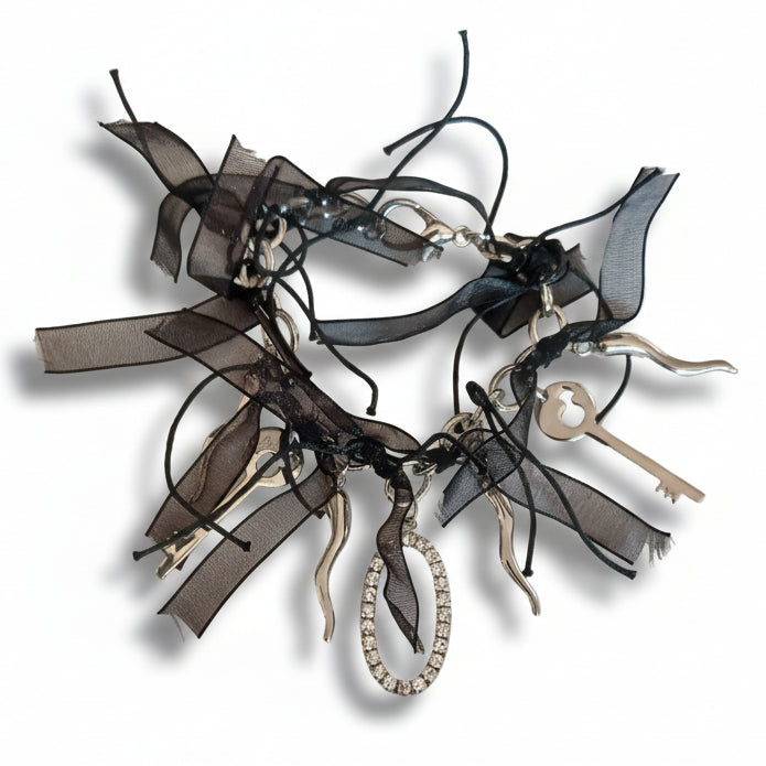 Bracciale elegante con charms e strass in tono argento, impreziosito da un delicato nastro in organza nera. Un accessorio raffinato che unisce stile contemporaneo e femminilità.